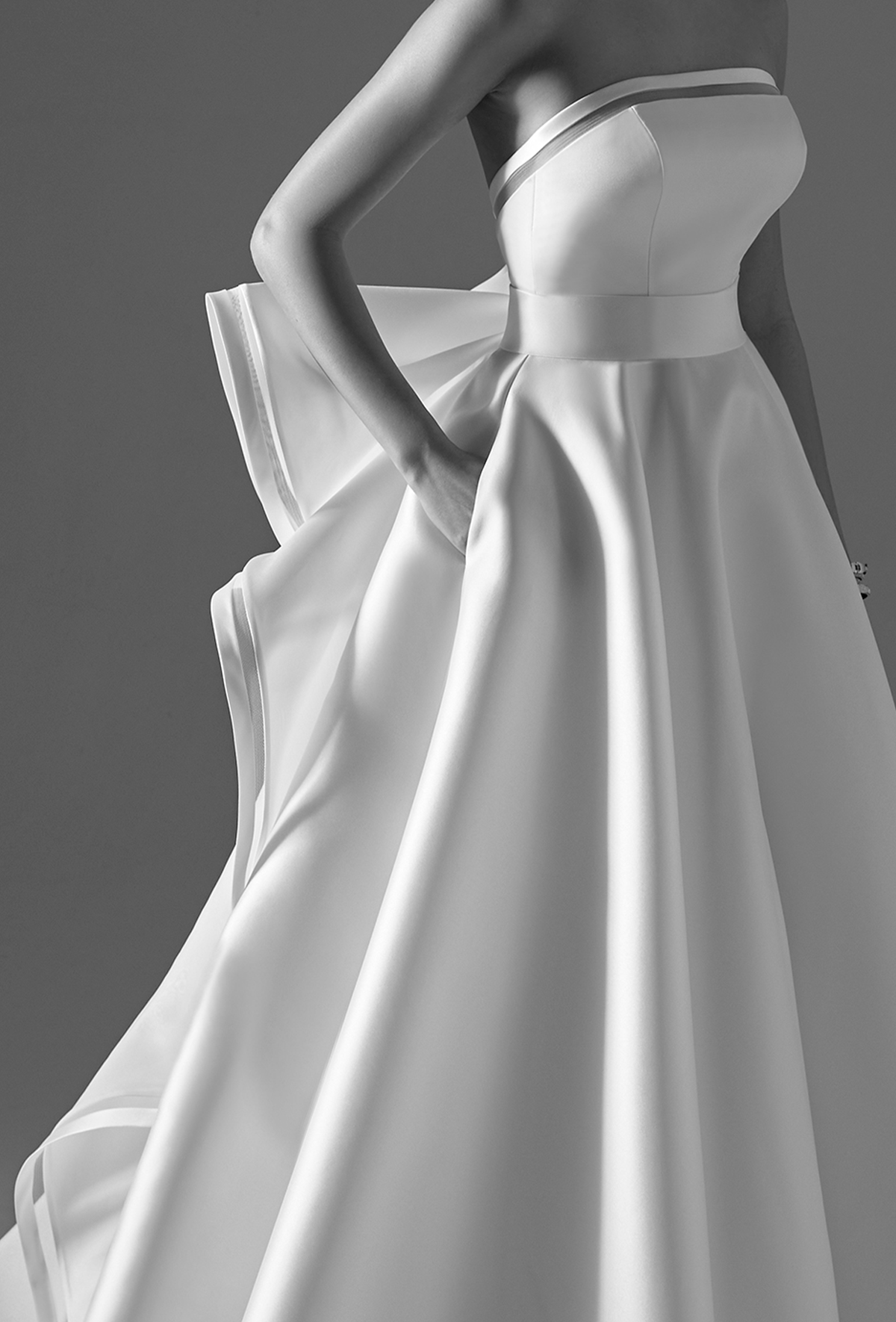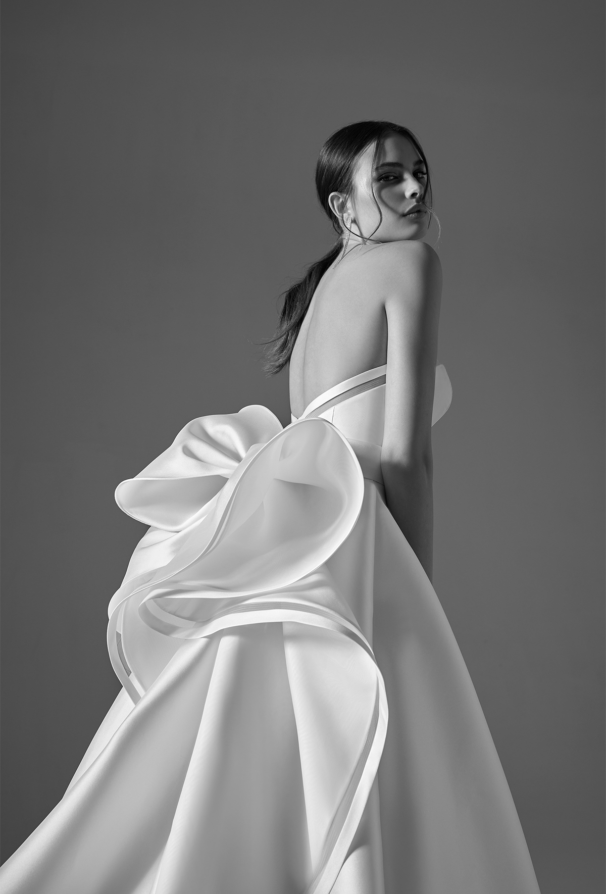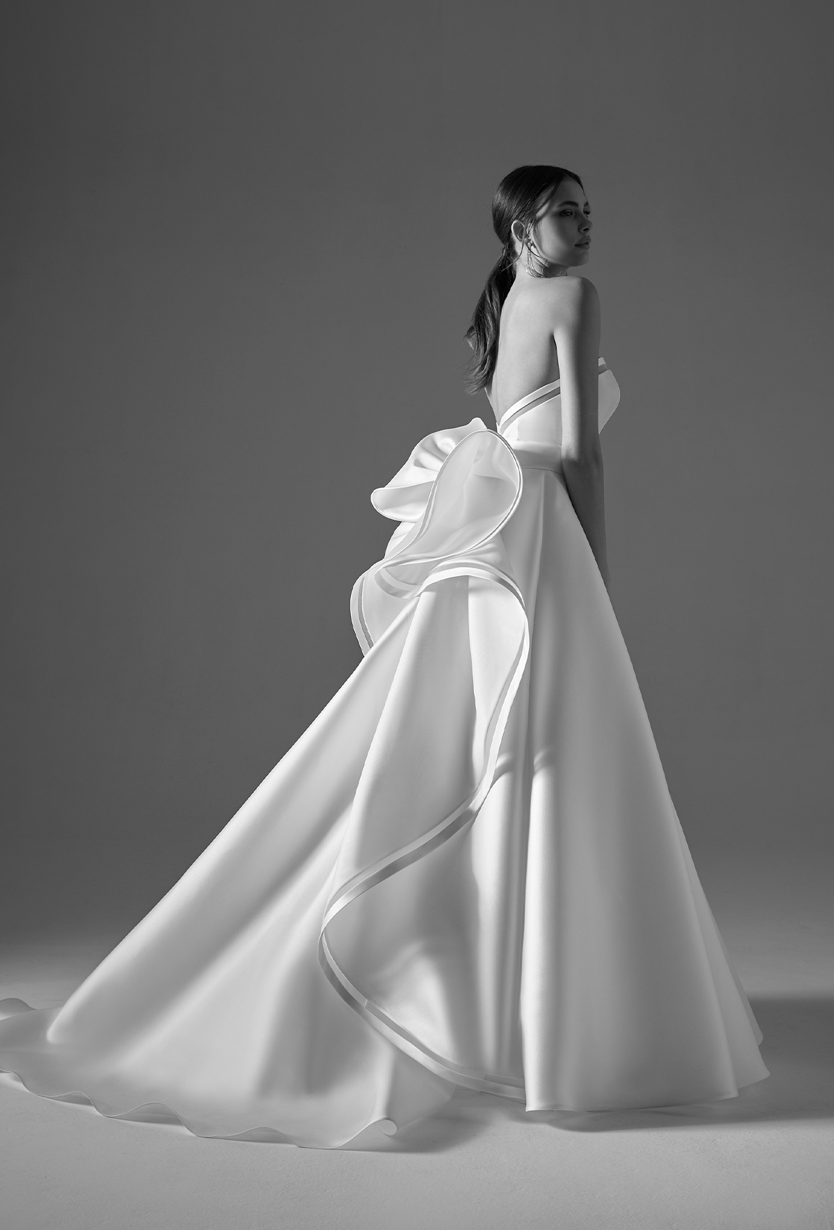 Sofisticato abito ampio in organza quadrupla. Lo scollo décolleté dritto è arricchito dalla crinolina in trasparenza che lo attraversa, ripetendosi lungo il volant della coda posteriore che nasce dal fiocco laterale posto in vita, donando movimento all’intera mise.