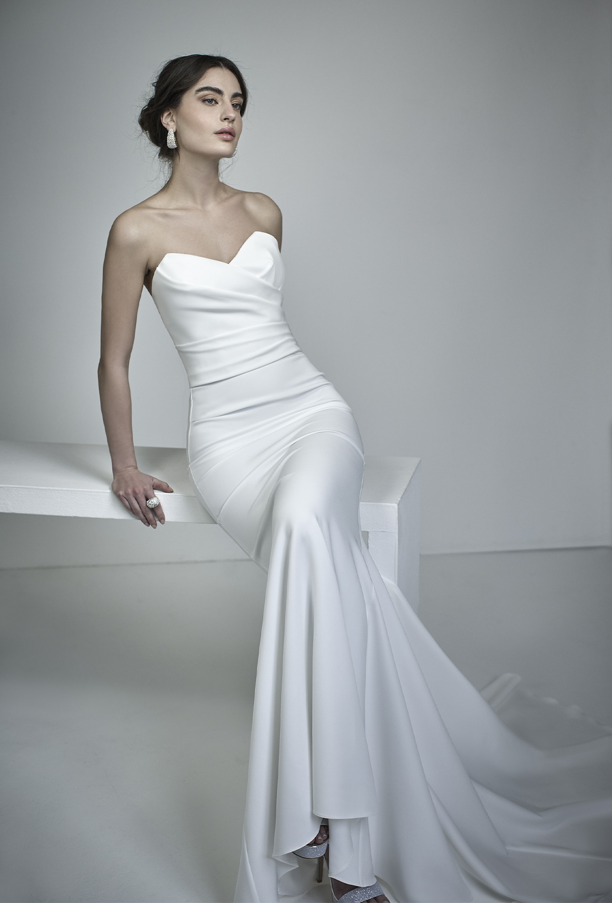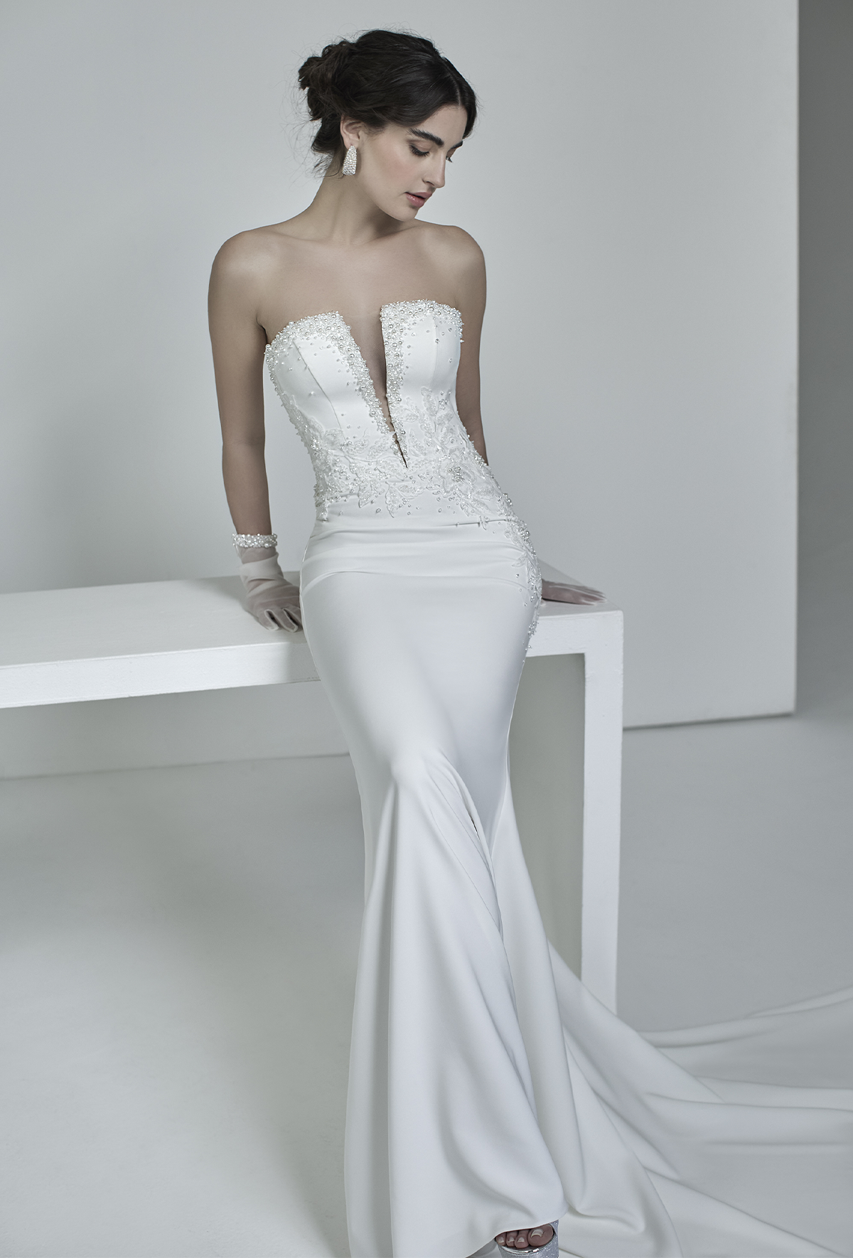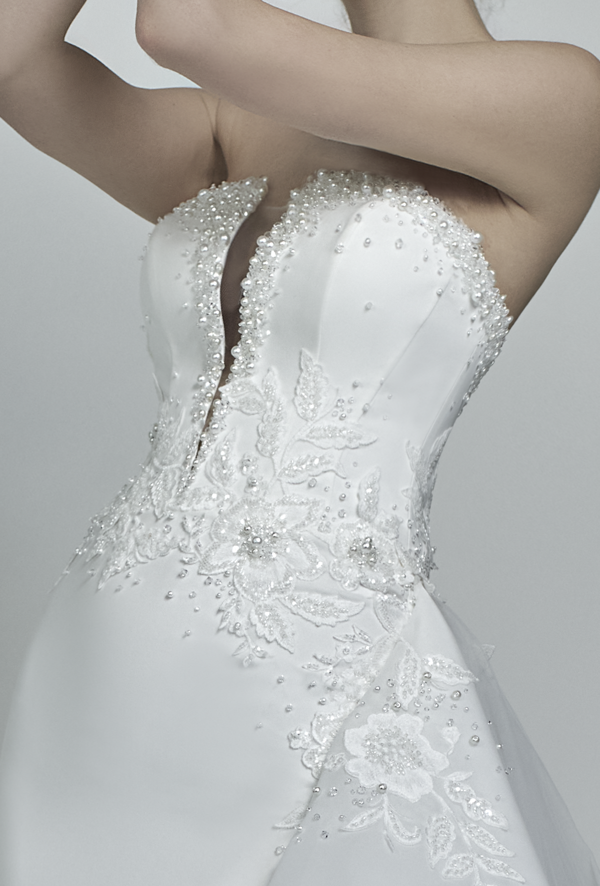 Raffinato abito sirena in cady stretch con scollo décolleté e profonda scollatura a V, valorizzata da un ricamo di cristalli e perle. Il corpino è decorato da applicazioni ricamate che si estendono fino a un fianco della gonna. Una vaporosa coda in tulle e organza completa la mise.
