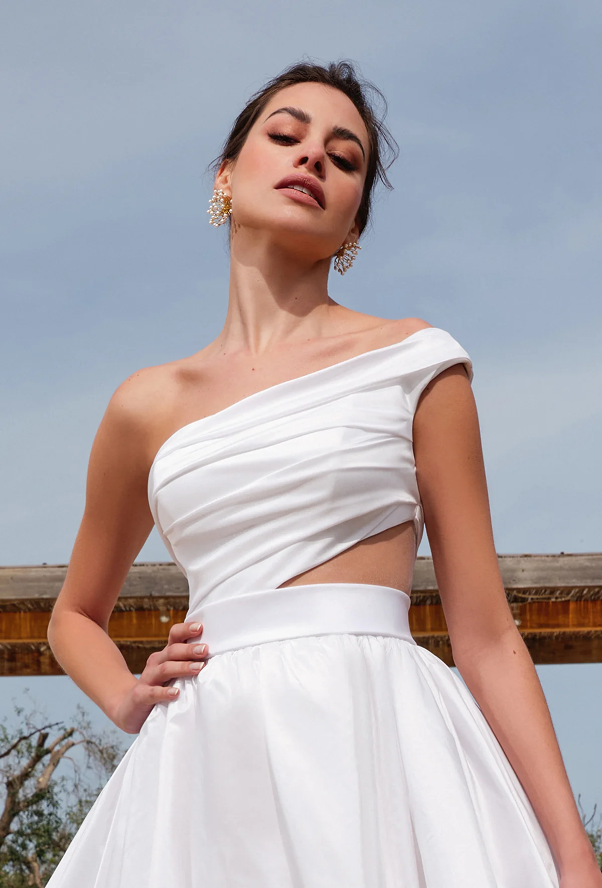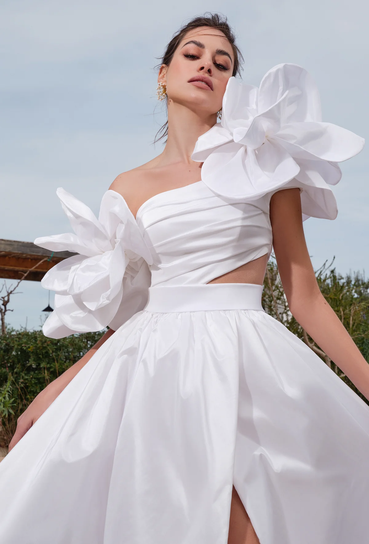 Ampio abito in taffetas con scollo monospalla e profondo spacco a portafoglio sulla gonna. Il corpino drappeggiato presenta una trasparenza trasversale su un fianco, mentre due grandi manicotti dalla forma floreale, sempre in taffetas, rendono questo capo originale e fresco.