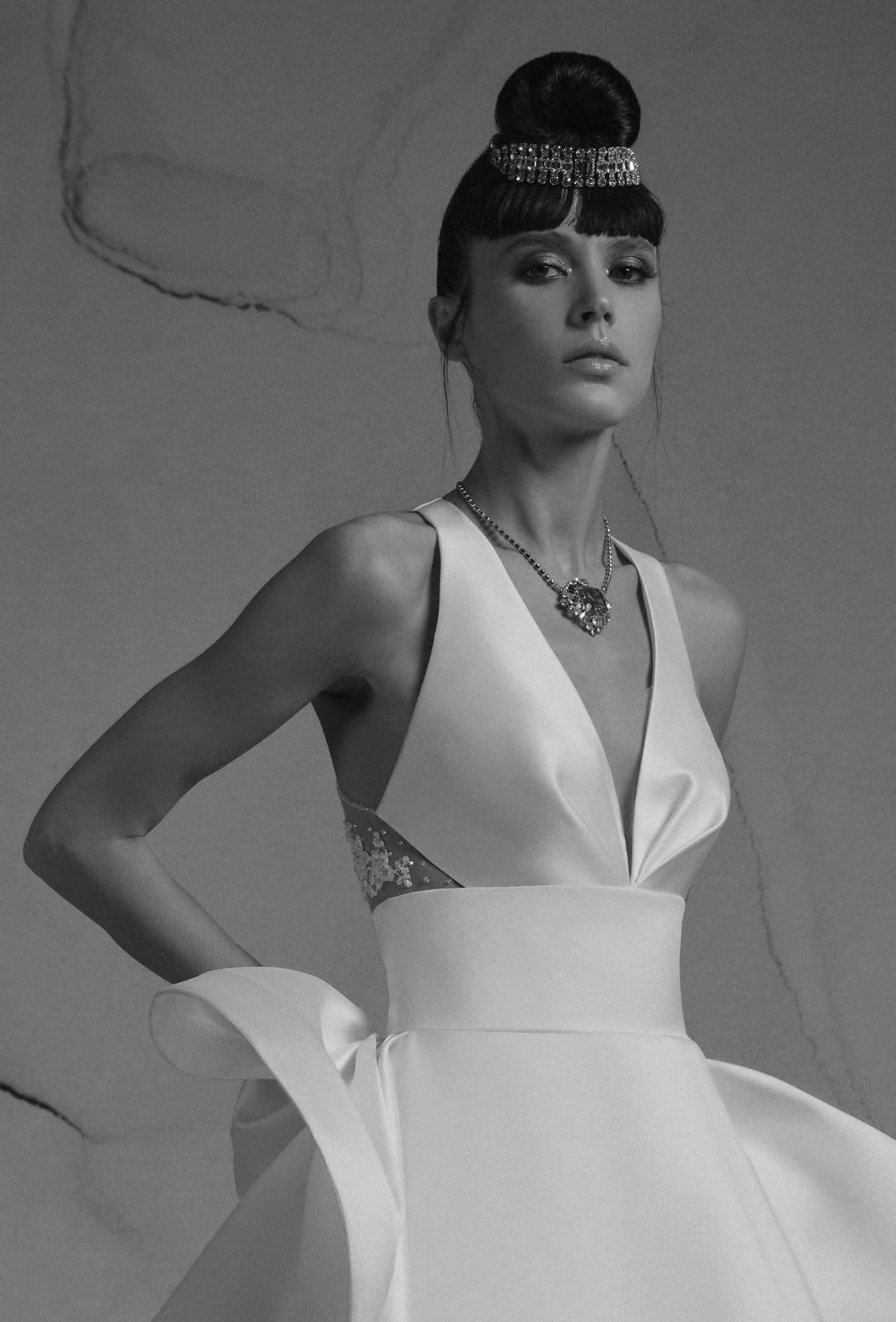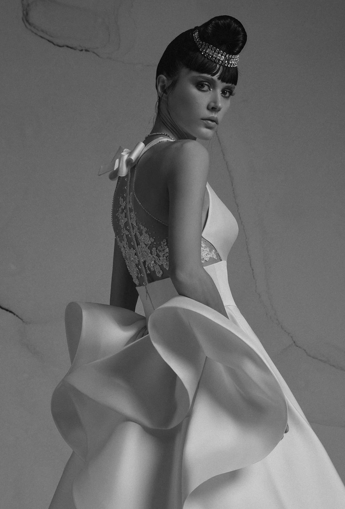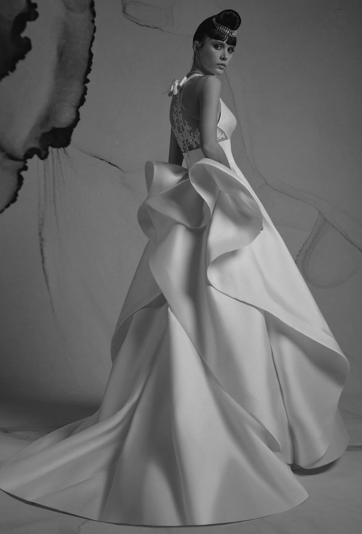 Wide quadruple organza dress, with a V-neck on the front and a tulle triangle with embroidered lace applications on the back. The bodice has pleats on the bust and a high waistband and it is highlighted by two large ruffles which enrich the train.