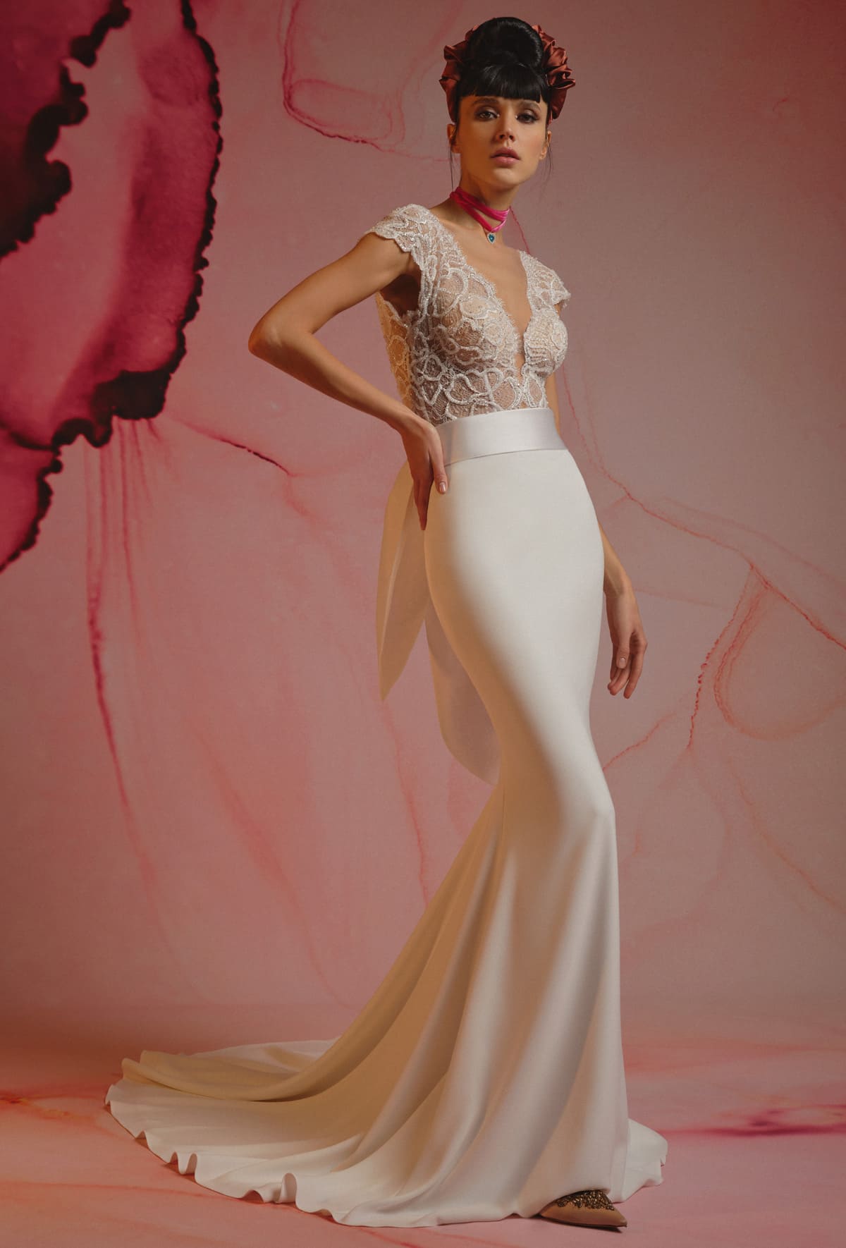 Wedding dress made up of a seductive stretch crêpe skirt, with a mermaid line, a soft bow on the back and a French lace body with a modern floral design, embroidered by hand with Swarovski crystals. A plunging V-line on the front and on the back gives sensuality to the entire dress.