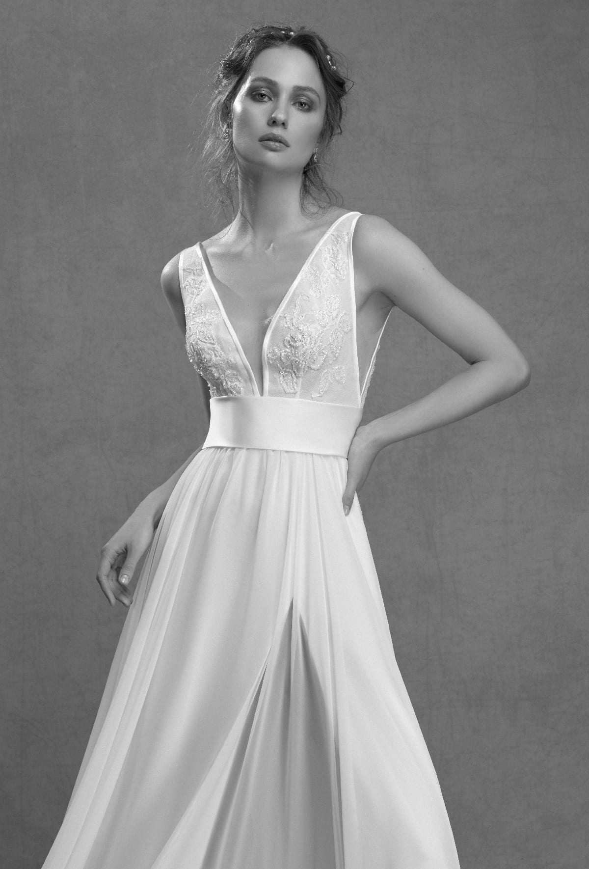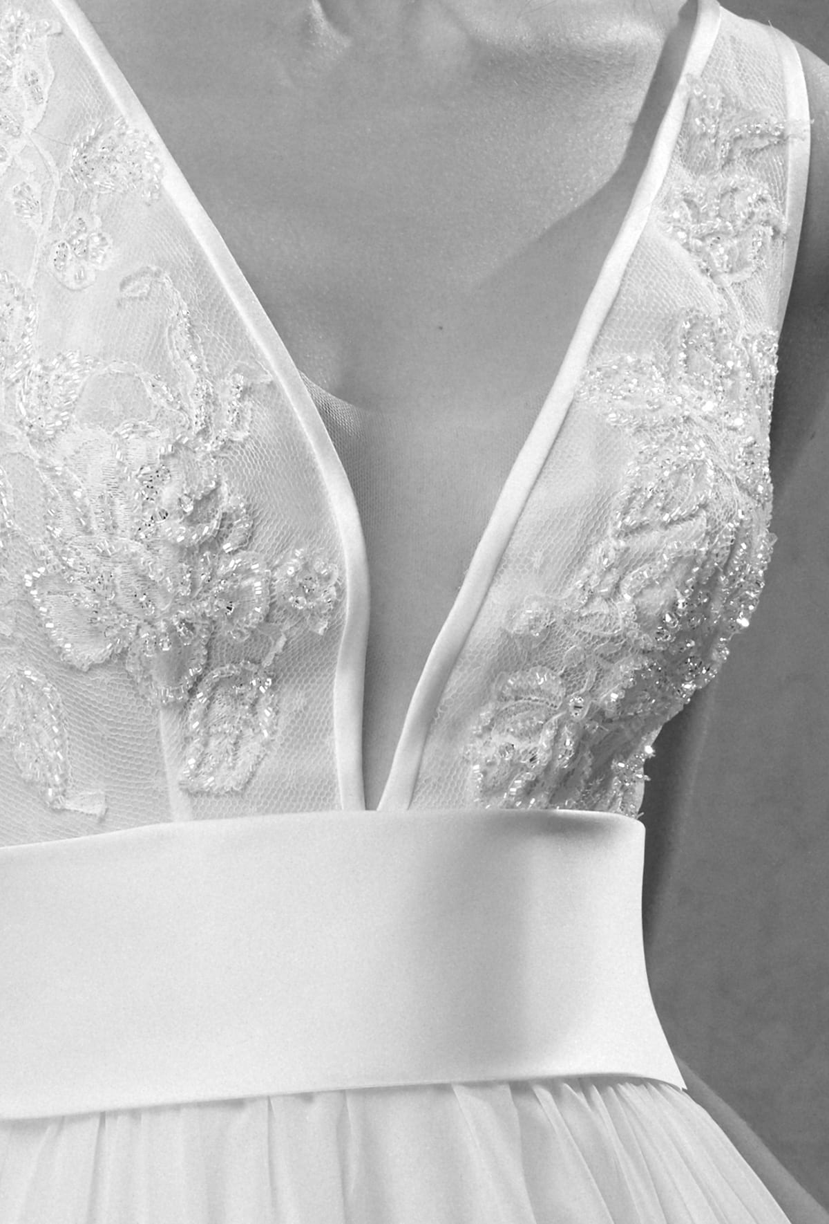 Georgette slip dress, whose flared skirt hides a slit in the underlying layers. The waist is outlined by a satin band, while the bodice has a double V-neck both on the front and back, and is made of a hand-embroidered French lace with floral designs, overlapping on the point d’esprit.