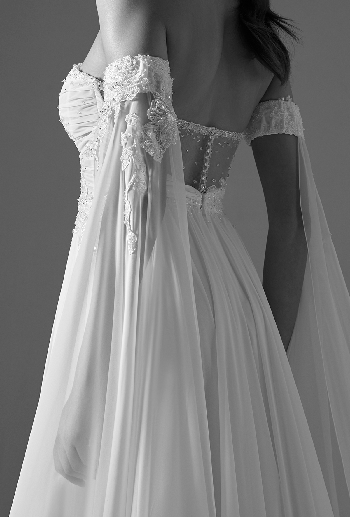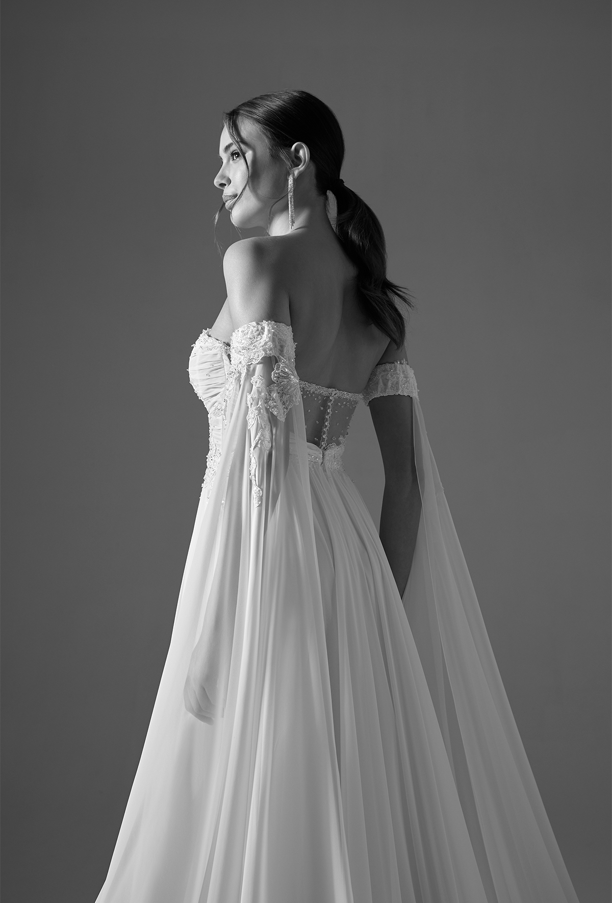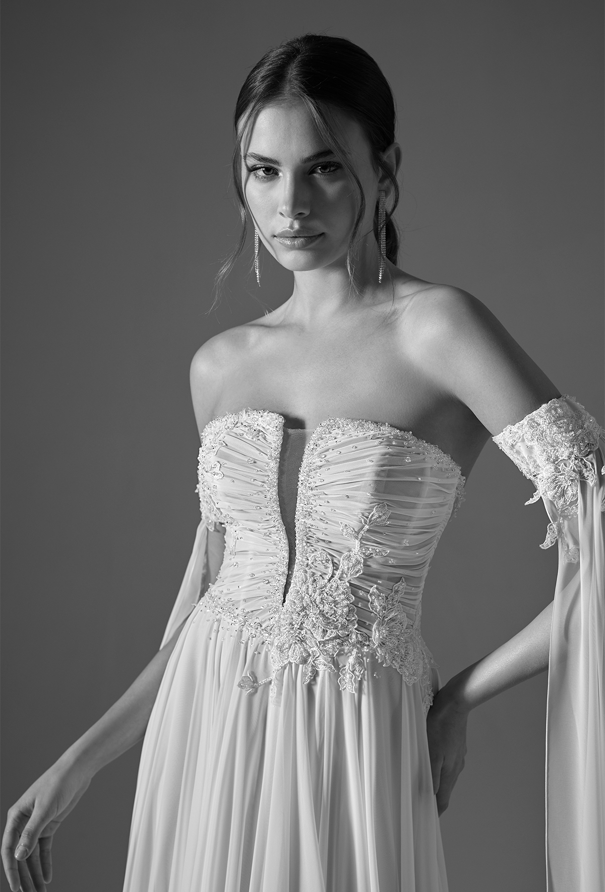 Graceful slip dress in chiffon, with a wide skirt and a décolleté bodice featuring a deep V-neckline. The drapery of the bodice is embellished with embroidered tulle applications and a light sprinkling of crystals. Two romantic chiffon sleeves complete the outfit.