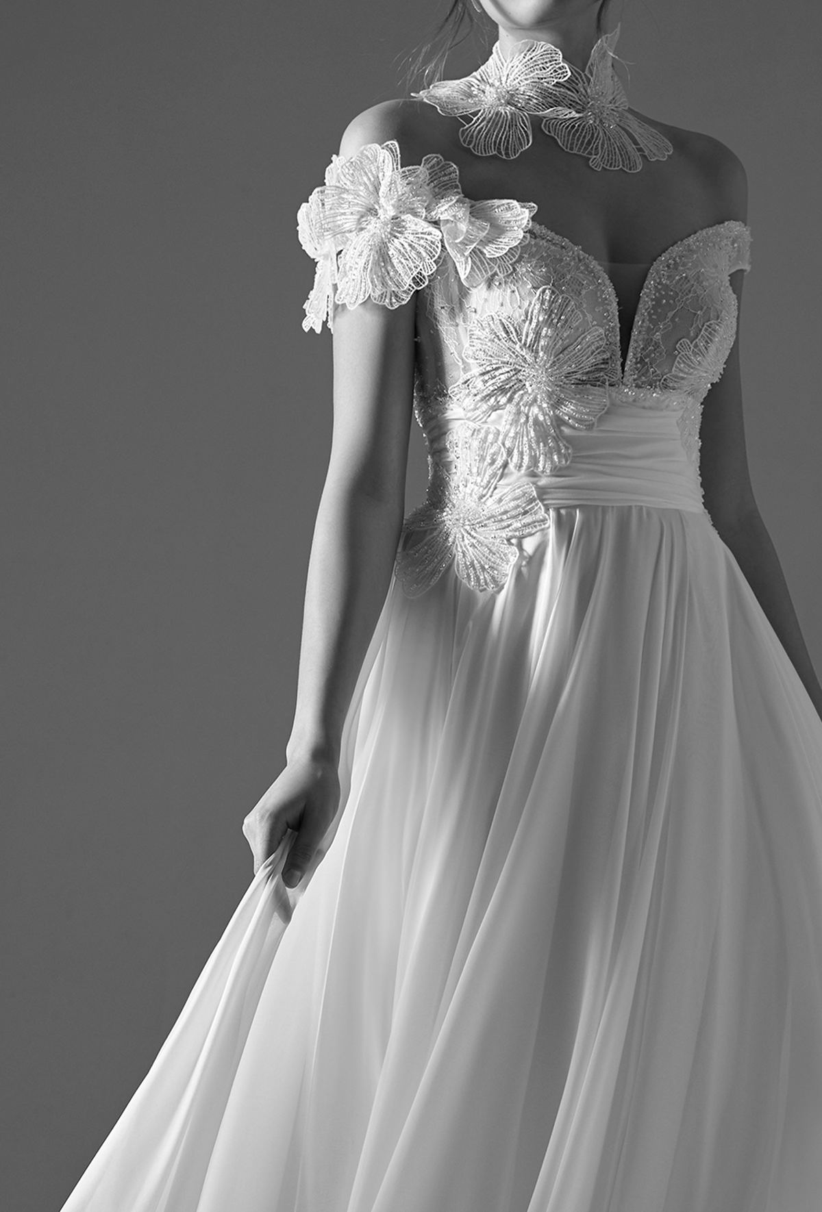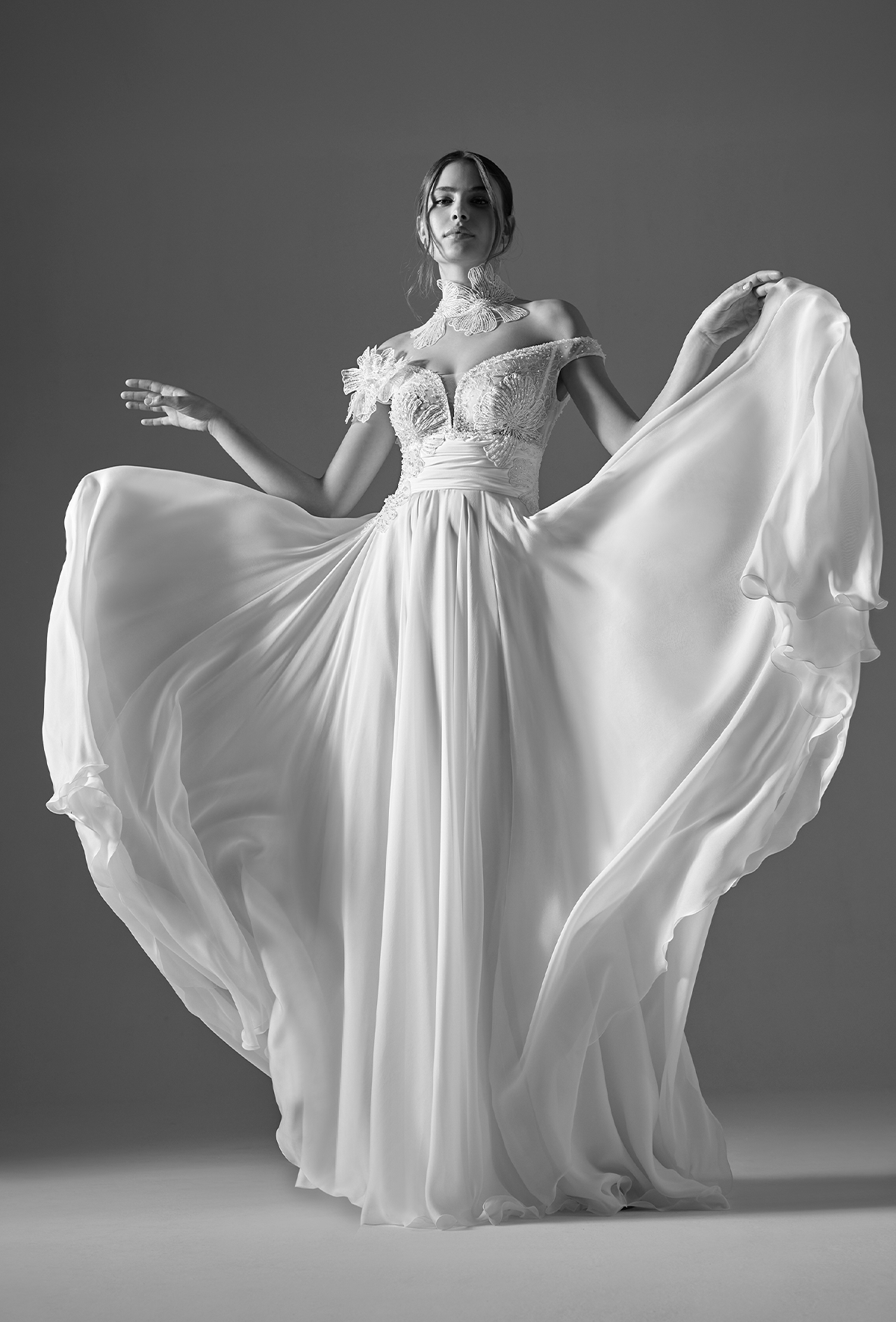 Flowing slip dress in silk voile with a flared skirt and a draped waistband. The bodice in hand-embroidered French lace, with an off-shoulder neckline, is adorned with flowers in filet lace that create a 3D pattern, while a delicate choker completes the outfit.
