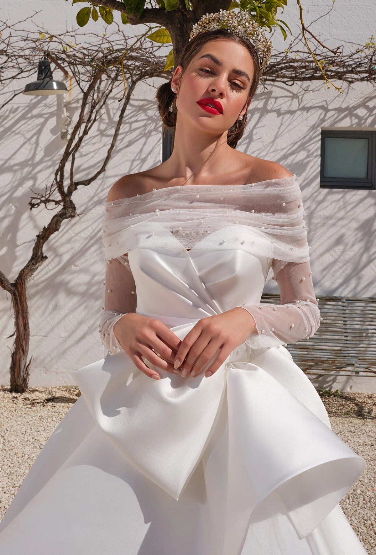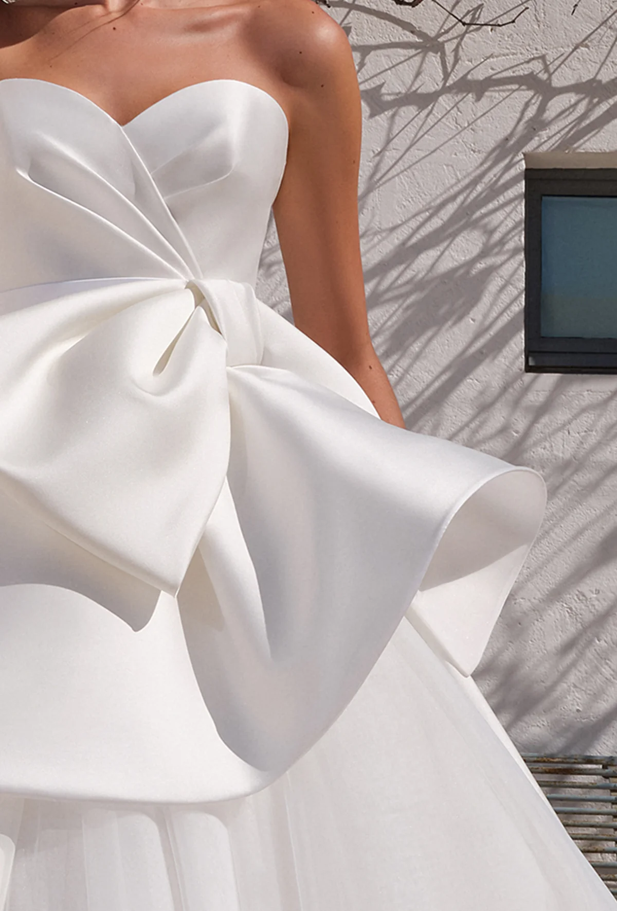 Wide traditional dress in quadruple organza and tulle. The bodice with wrap décolleté neckline has a duchesse band on the waist, from which a large drooping bow originates, while the skirt is embellished with an elegant ruffle.
