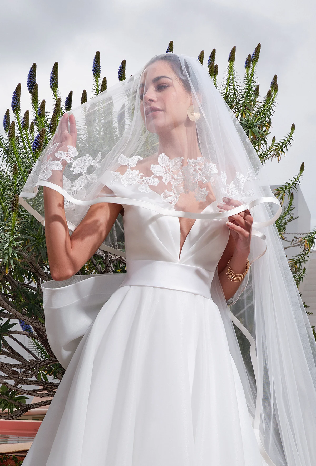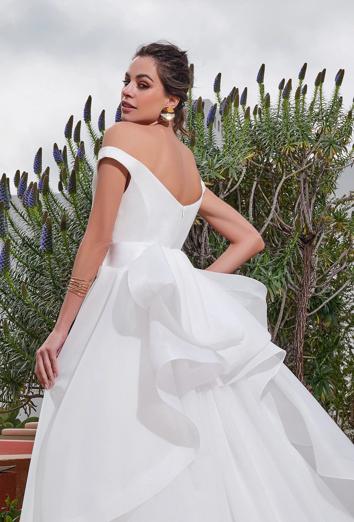 Extremely clean wide dress, with humeral neckline and flared skirt in double organza. On the back, a tulle tail opens from the organza ruffles. A drooping bow and a duchesse band at the waist complete the dress.