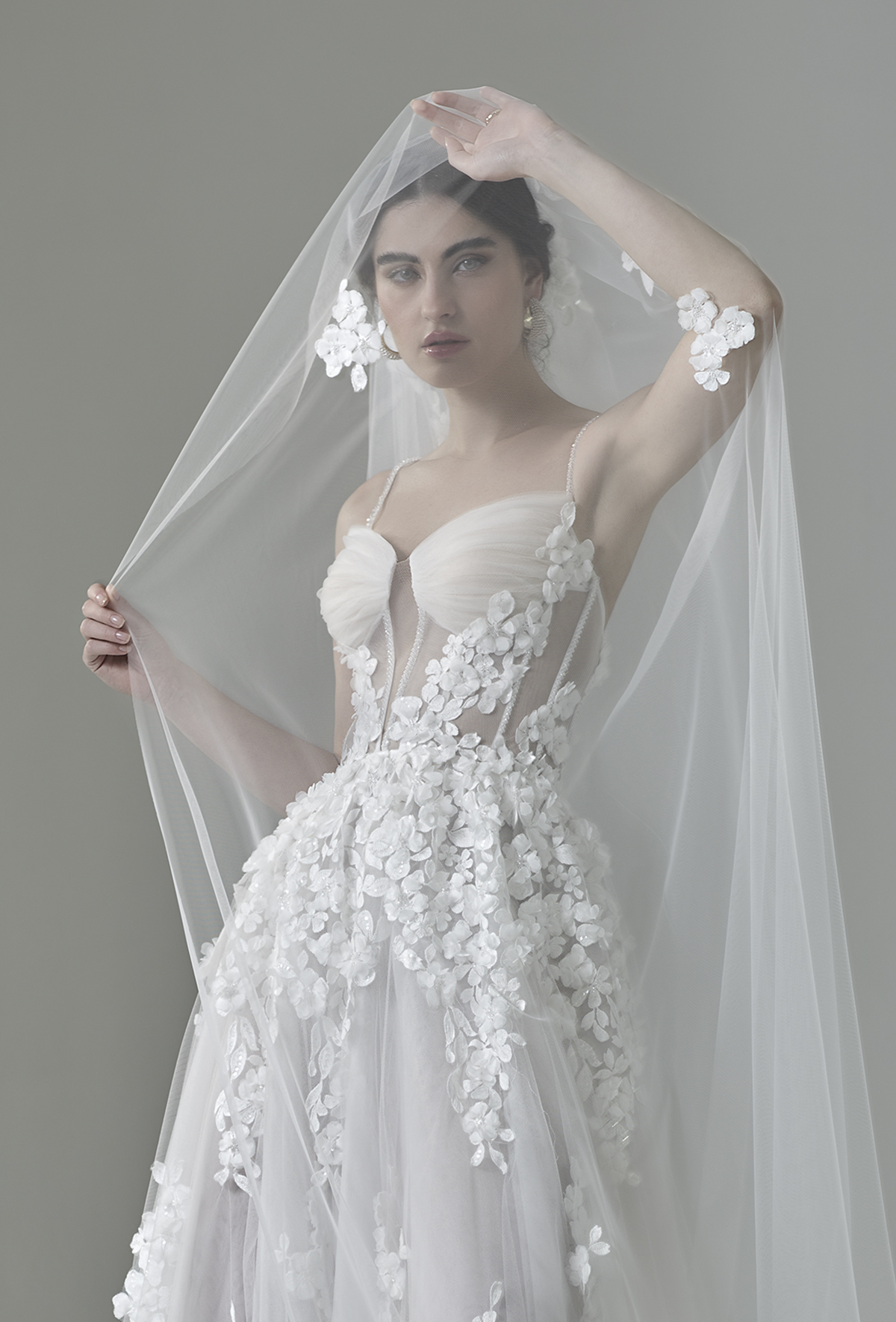 Soft gathered veil without edging, attached to a comb, made from tulle embroidered with 3D floral applications in a degradé effect.