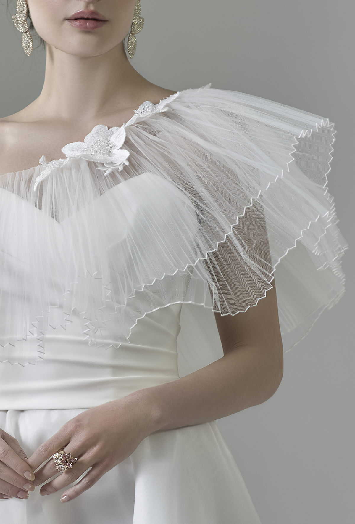 Off-shoulder ring-style shawl in pleated tulle, enhanced with an embroidered tulle application on one shoulder.